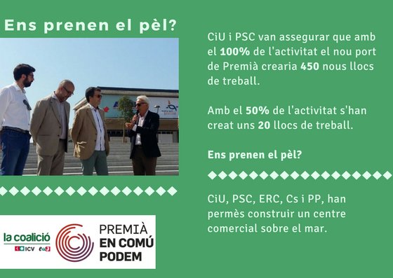 Quan fa tres anys es va modificar el pla del port per permetre una zona comercial sobre l’aigua, un dels arguments més recurrents, que tant l’Equip de govern com l’empresa concessionària feia servir, era que el nou centre comercial crearia 450 llocs de treball (Blog del tinent d’alcalde David Gutierrez, Noticia a La Vanguardia, Noticia a Ràdio Premià, Noticia a El Punt Avui).